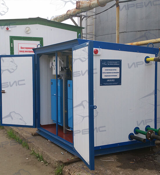 Такие котлы будут размещены в металлическом боксе с утепленными стенами. Размер короба может также быть подобран индивидуально. Бокс обеспечивает защиту оборудования от негативного воздействия окружающей среды и атмосферных осадков и позволяет эксплуатировать котлы при температуре от -45 до +40 градусов.