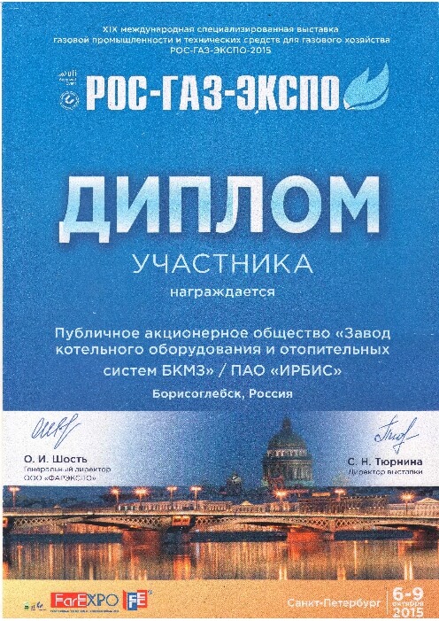 Диплом участника выставки котельного оборудования ПАО «Ирбис»